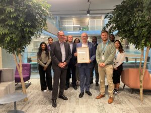 Below: Ad Herejigers, Director UK and Sustainability Lead, RITTERWALD Consulting, presents the certificate to MTVH colleagues